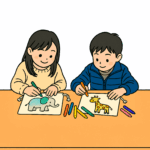 ゾウキリンがプリントされた巾着に好きな色で色付けをします。